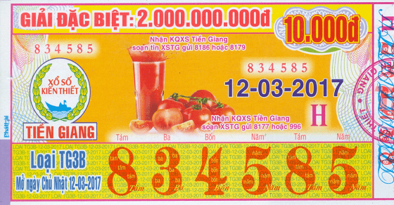Vé số Tiền Giang được phát hành bởi Công ty TNHH MTV xổ số kiến thiết tỉnh Tiền Giang. Với cơ cấu giải thưởng hấp dẫn, giải đặc biệt lên đến 2 tỷ đồng, hiện nay xổ số Tiền Giang đang trở thành một loại hình vui chơi có thưởng rất thu hút tại địa phương.